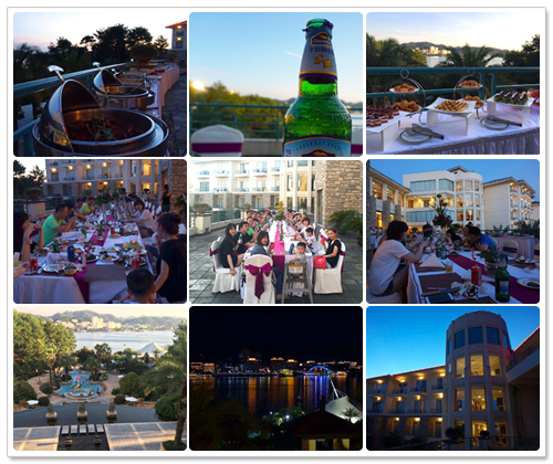 傍晚,斜阳夕照,微风轻拂,公司特地包场了酒店3楼湖景阳台为全体工员准备了一场丰盛的BBQ大餐。经过了一整天的嬉戏疯闹,欣赏着湖光斑斓的夕阳美景,享受着沁人心脾的冰镇啤酒和大快朵颐的饕餮美食,实在是无法用语言形容的悠闲爽快。