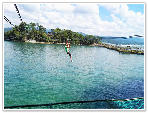 8月14日,又是一个蓝天白云大晴天,宝屋团队开始了第二天的行程,上午搭乘酒店的快艇,划过碧波白浪,来到了心锁相连的月光岛和一览千岛全景的梅峰岛。一边汗流浃背地穿梭在自然氧吧,一边呼吸着透彻心扉的新鲜空气,连同身体的疲惫与心里的积劳一起抛空在九霄云外。好几名“胆大妄为”的员工,悬吊钢索,飞速滑翔过月光岛“系园”和“心园”之间的潾潾湖面,尽情地体验了一把蜘蛛侠的飞檐走壁。